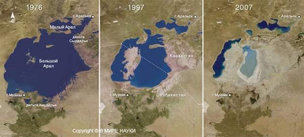 Тому пример гибель Аральского моря, некогда являвшегося источником жизни большого района, бывшее бессточное солёное озеро в Средней Азии, на границе Казахстана и Узбекистана.